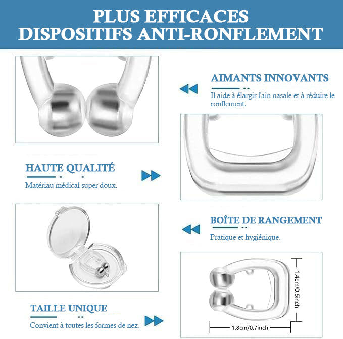 Pincez-vous simplement le nez avec notre dispositif anti-ronflement pendant que vous dormez. Aucune douleur ni dommage à votre nez, notre appareil anti-ronflement augmente la respiration de l'air pendant le sommeil. Les bouchons magnétiques contre le ronflement sont réutilisables et faciles à nettoyer.