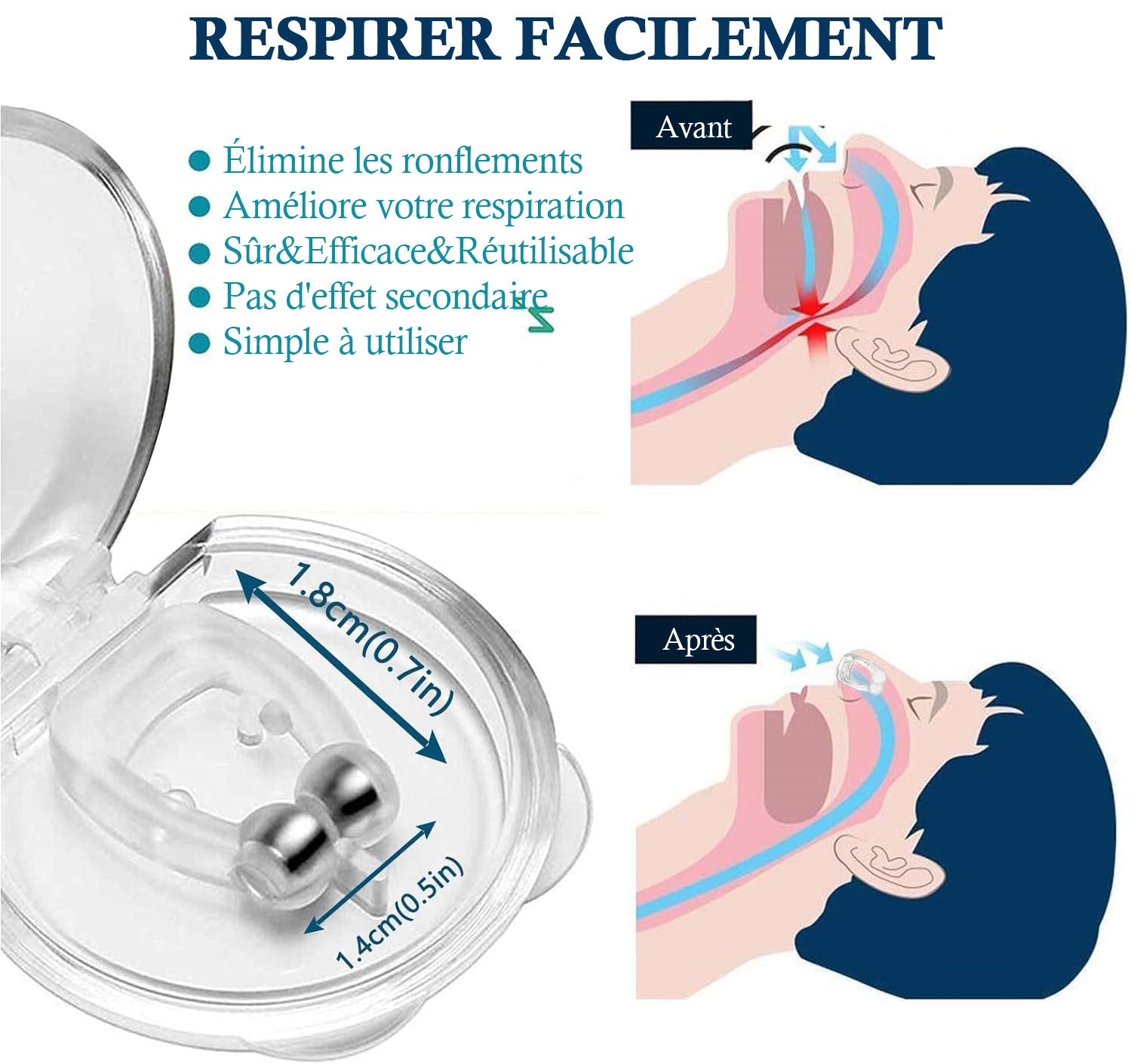Fabriqué à partir de silicone souple, notre dispositif anti-ronflement est sûr, pratique et adapté à toutes les formes de narines. Arrêter de ronfler peut non seulement empêcher le ronflement quotidien, mais également changer l'habitude de respirer par la bouche pendant le sommeil. - Facile à utiliser et réutilisable